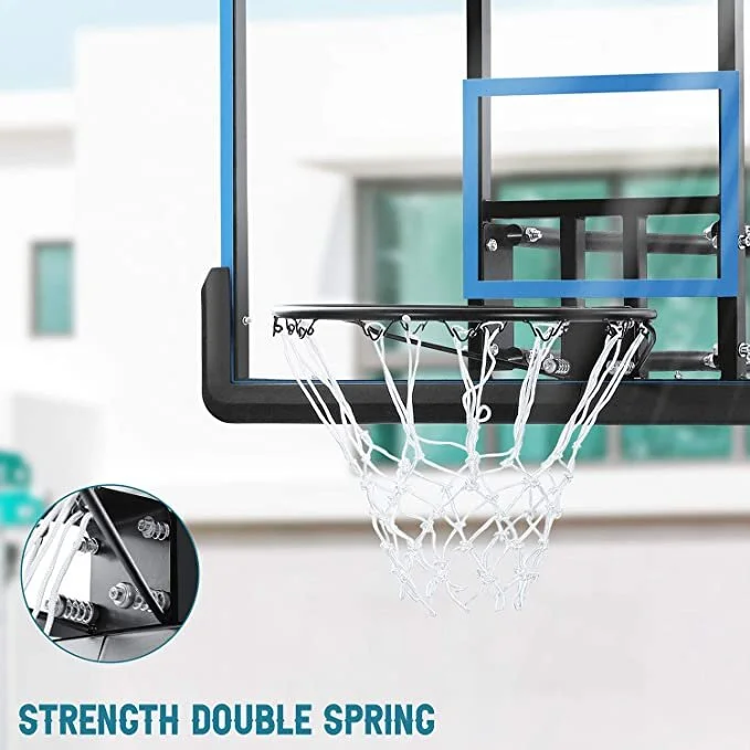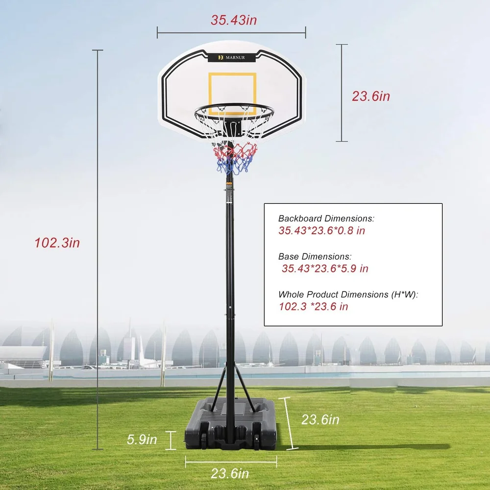 Base dimensions 432 in x 30 in x 65 in. This portable basketball system offers a shatterproof polycarbonate backboard. Rollerbase that is filled with sand or water to provide stability.