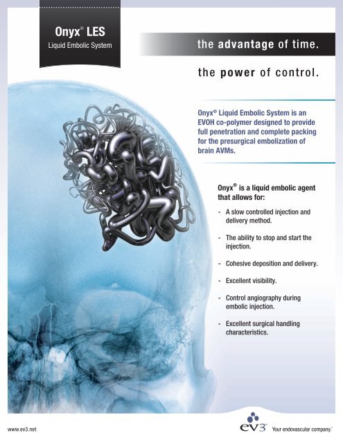 Description of the Onyx LES Device Onyx is the trade name for a liquid polymeric embolization device manufactured by Micro Therapeutics Inc. Summary of Safety and Probable Benefit. PDF View Shellock R D Services Inc. Onyx Liquid Embolic System. Designed for presurgical embolization of brain arteriovenous malformations bAVMs Onyx liquid embolic system LES is a pre-mixed radiopaque injectable embolic fluid consisting of the following components. When injecting Onyx LES fluoroscopic visualisation should reveal Onyx LES traveling through the catheter lumen. Ethylene vinyl alcohol or Onyx copolymer Medtronic is an embolization agent increasingly used in peripheral interventional radiology.